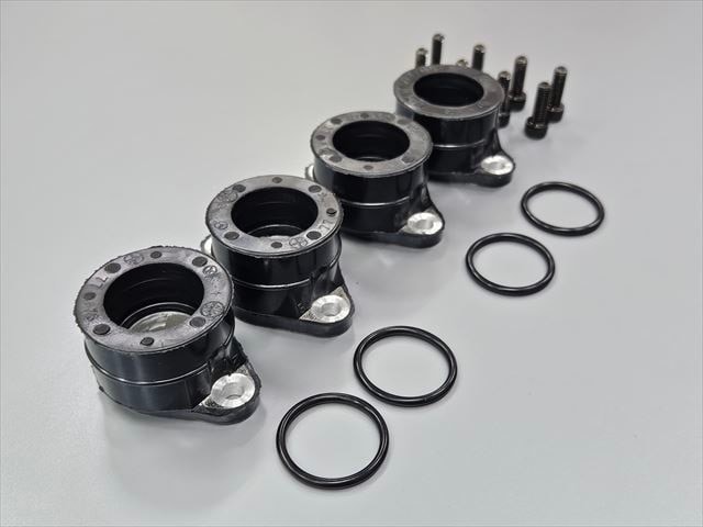 ■キャブとエンジンを連結するための黒いゴム部分になります。この部分が劣化しますと外観にヒビが入り、ヒビ部分やオーリング部分からエンジン内部に空気が入るようになります。そうしますとエンジンの回転落ちが悪くなったり、エンジンのかかりが非常に悪い症状が出ます。そのため外観にヒビなどが入っている場合は早めの交換をお奨め致します。